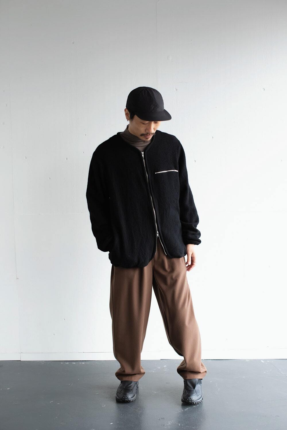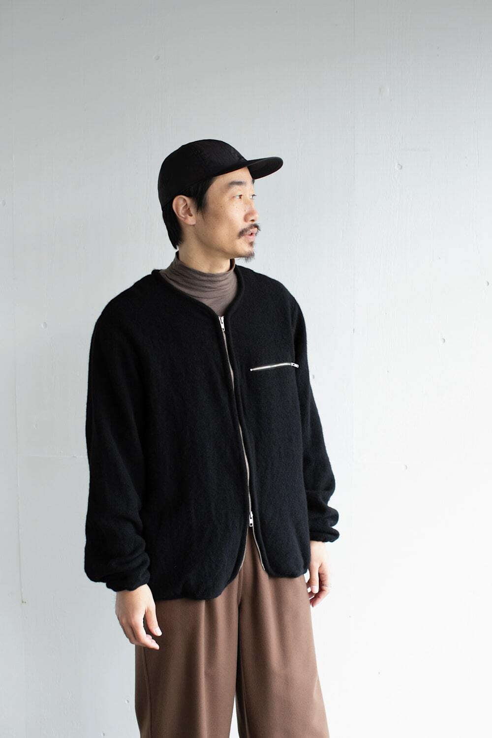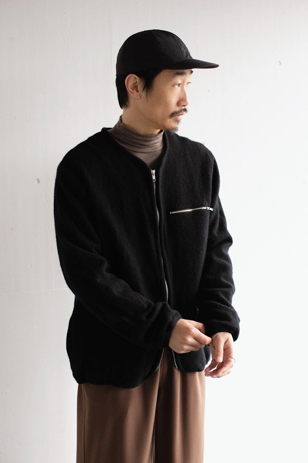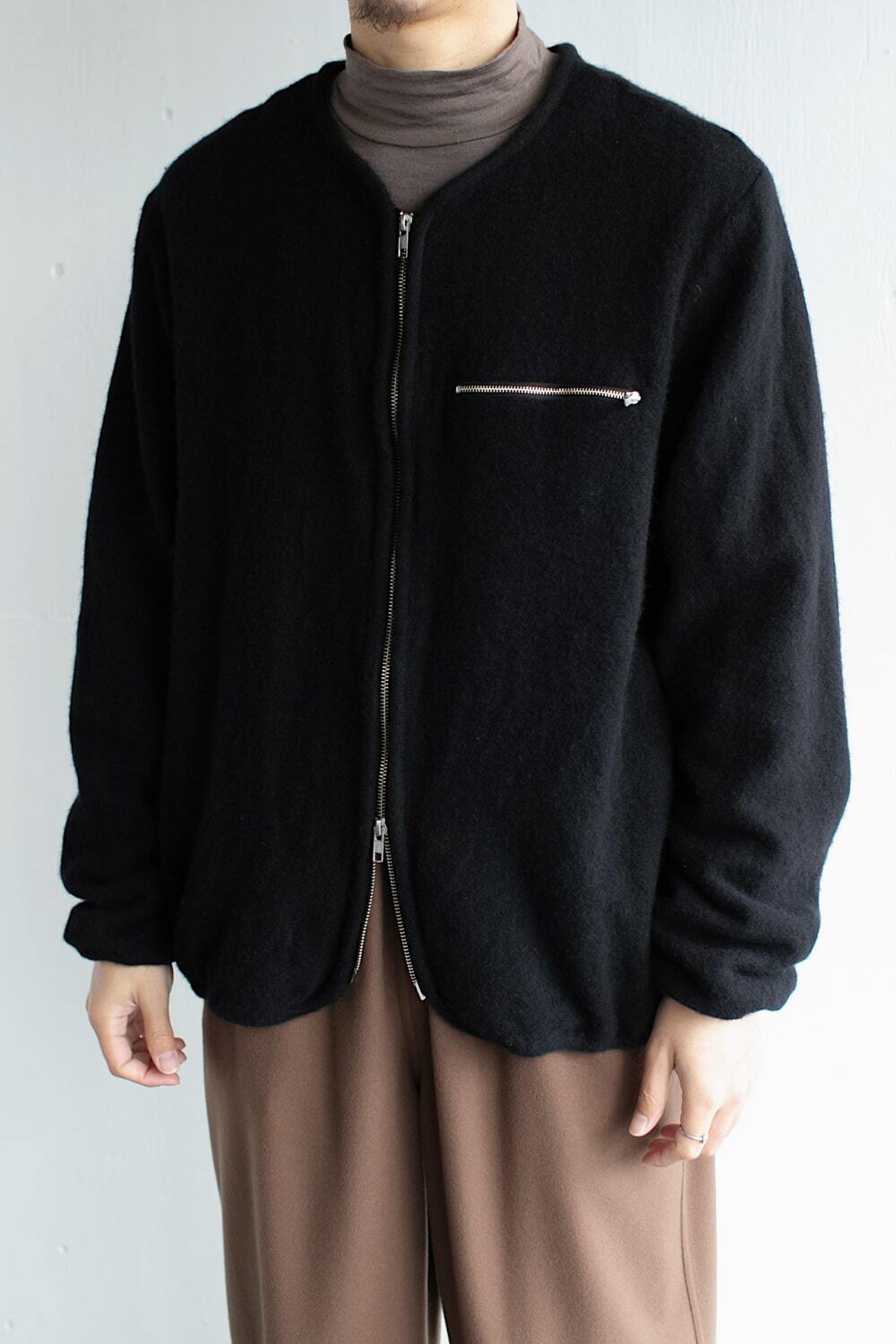 カーディガンという名前ではありますが、ノーカラーのジャケットとしても、フリースのようにも使える万能な一着です。