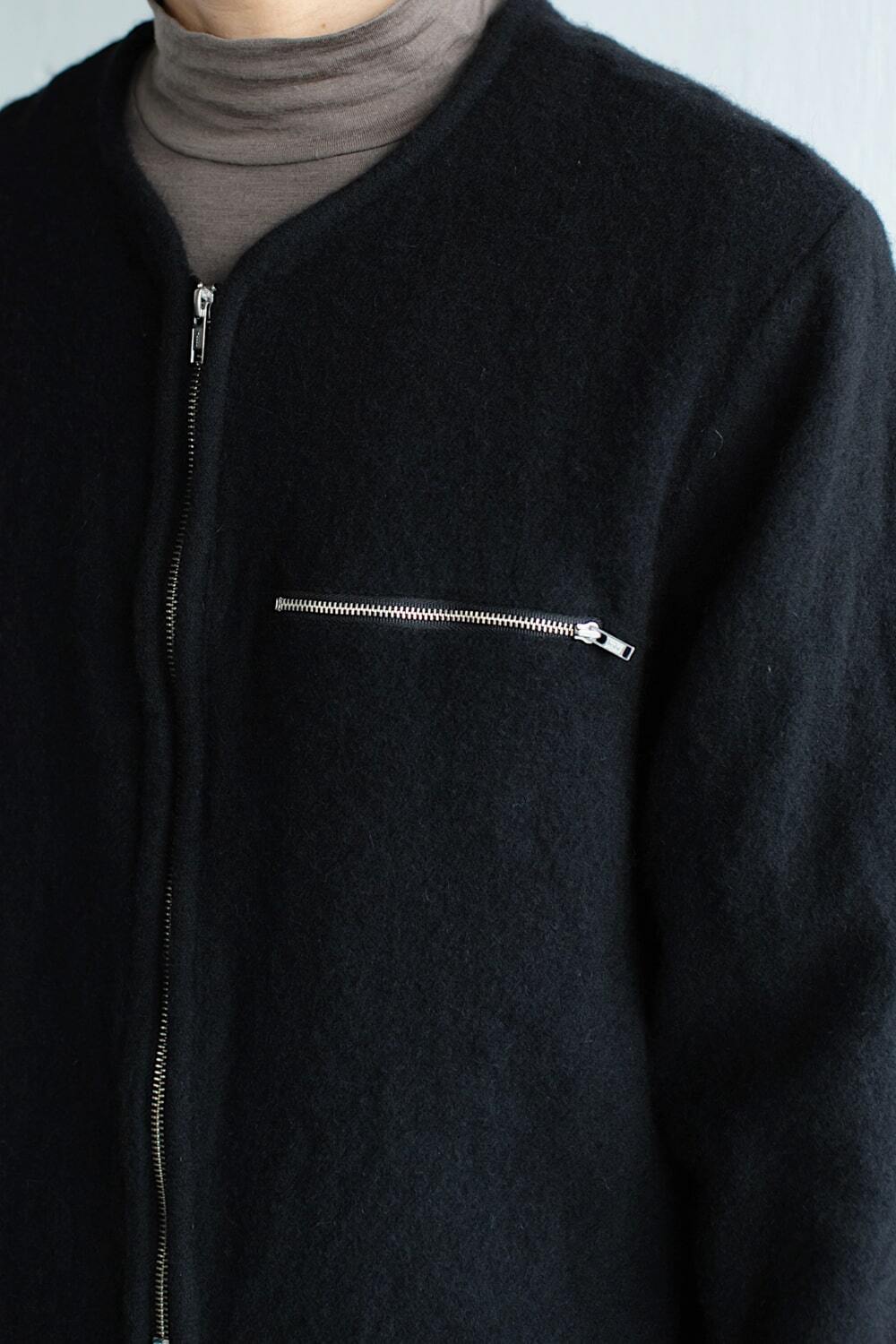 メリノウールに英国羊毛を20%ブレンドした生地で、柔らかく肌馴染みの良いジップタイプのカーディガン。