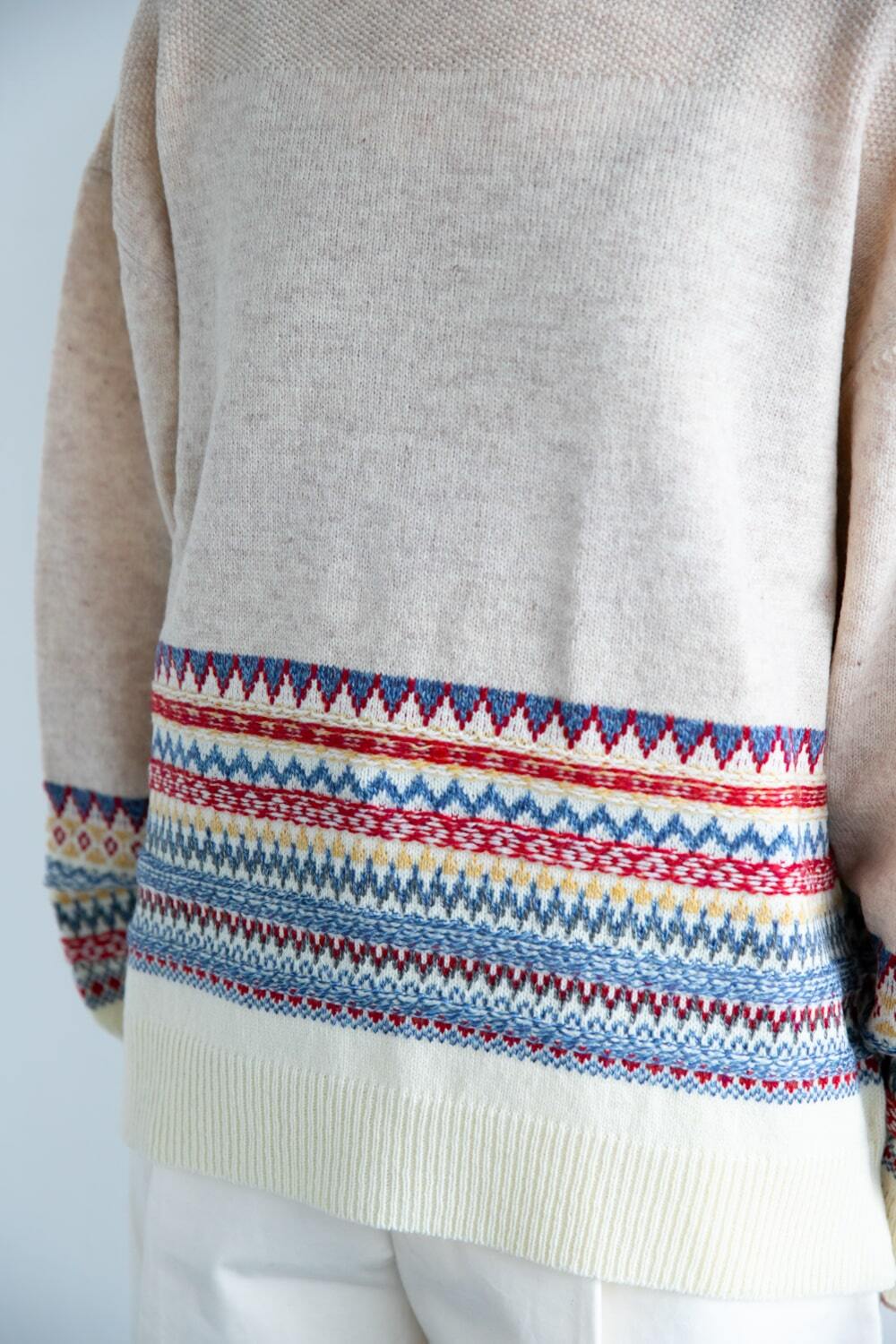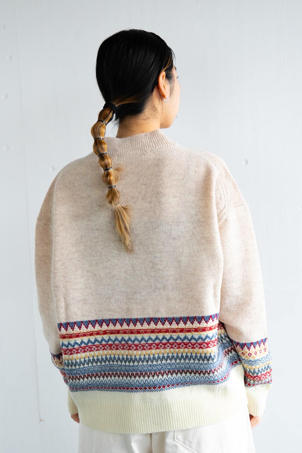 ベージュやブラックといったシンプルなカラーに、サーミの民族衣装から着想を得たジャガードの織り柄がアクセントとなった、ニットプルオーバー。