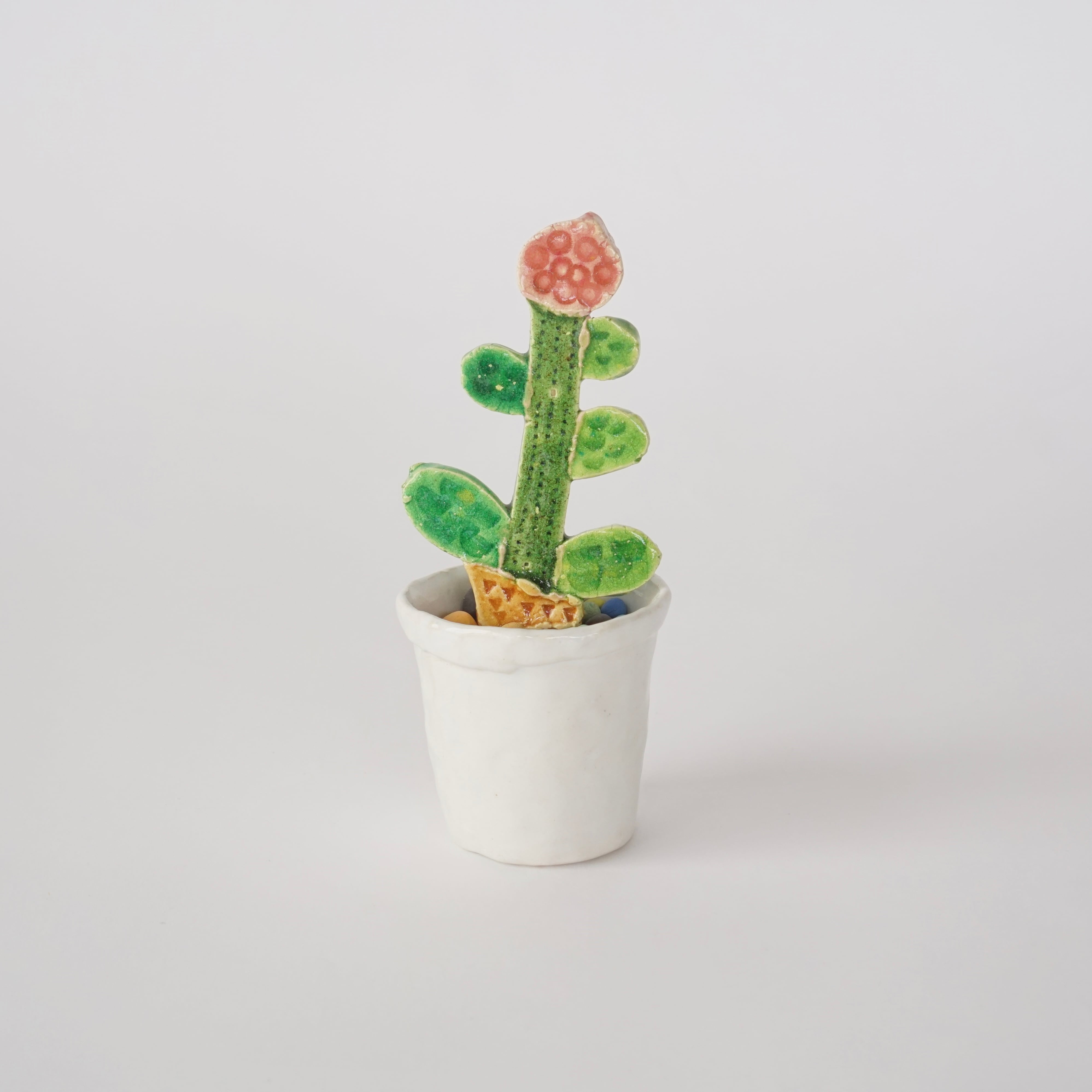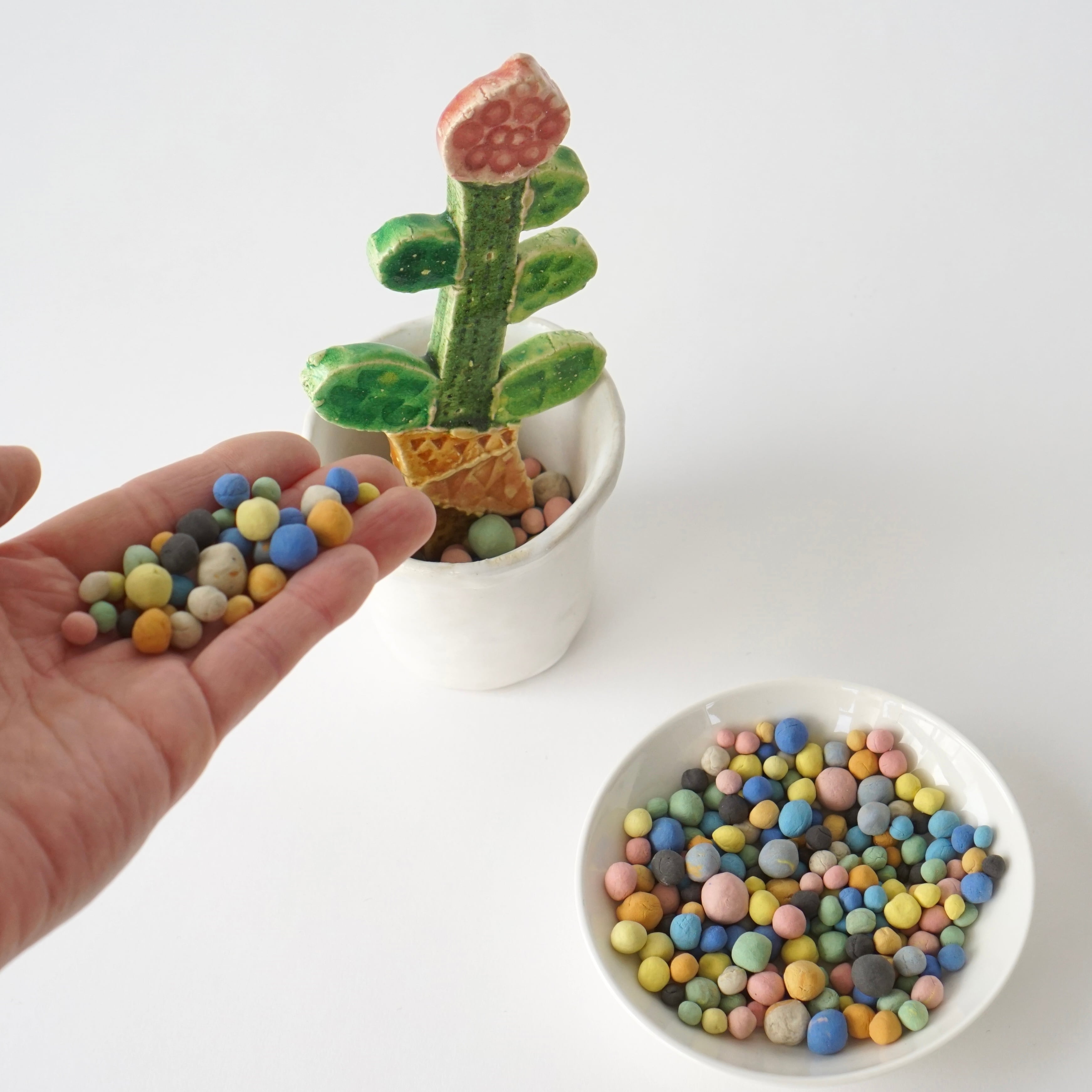 植物を植えるためのカラフルな土まで全てやきもので制作した植木鉢です。
