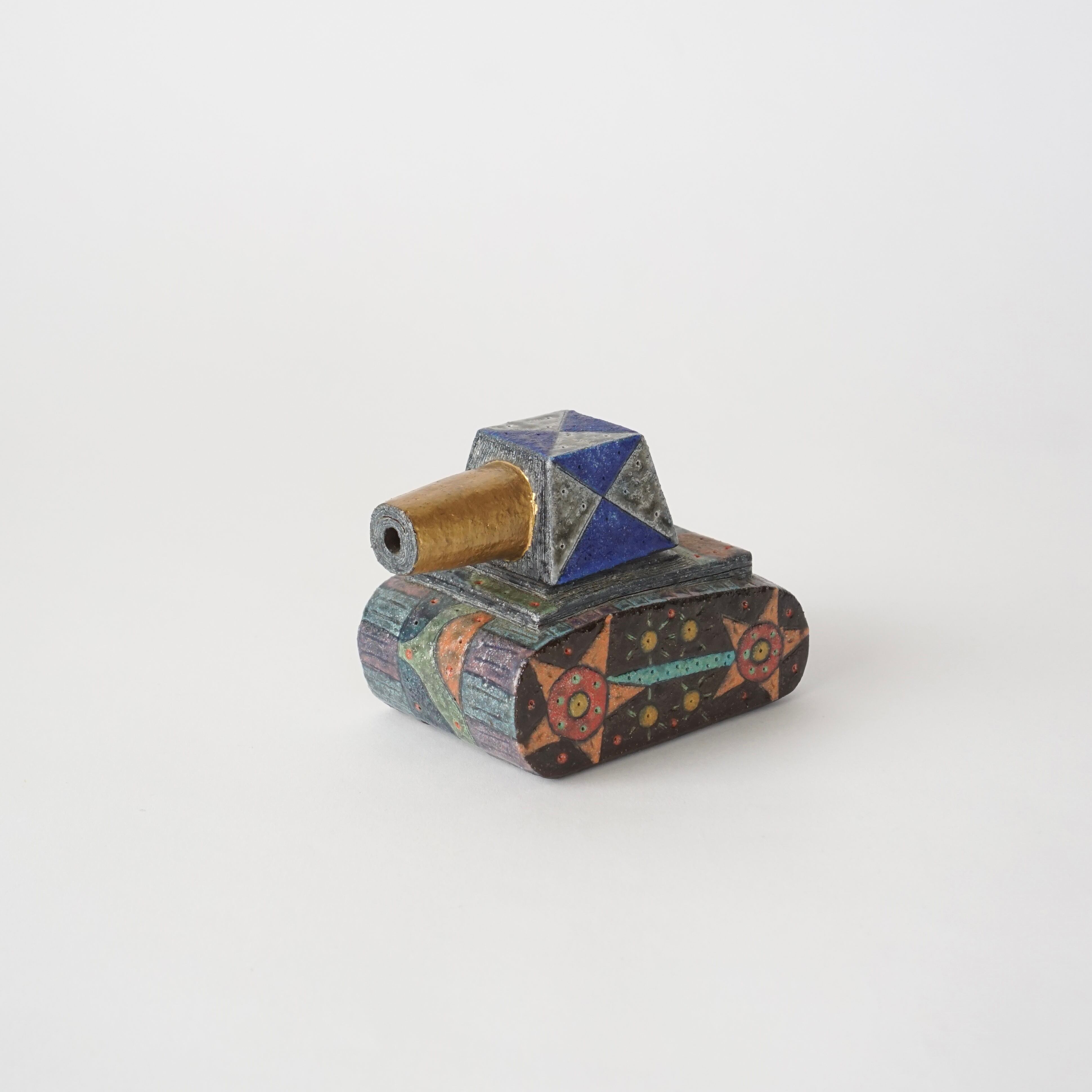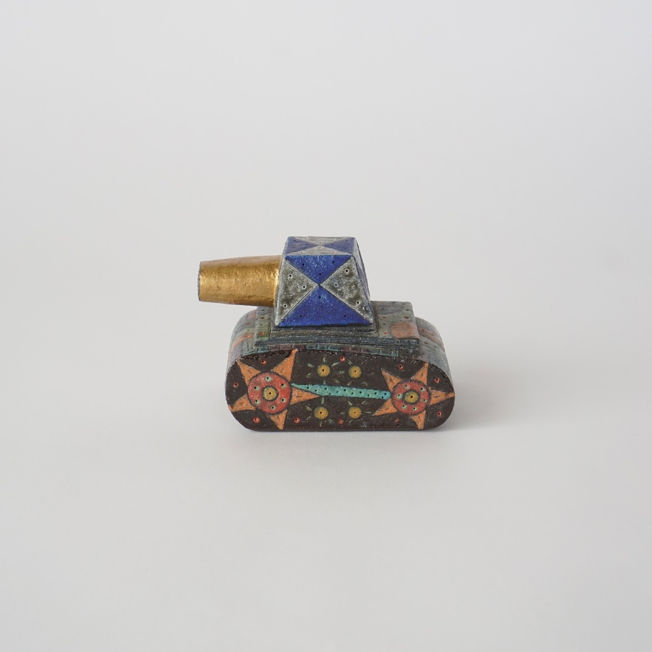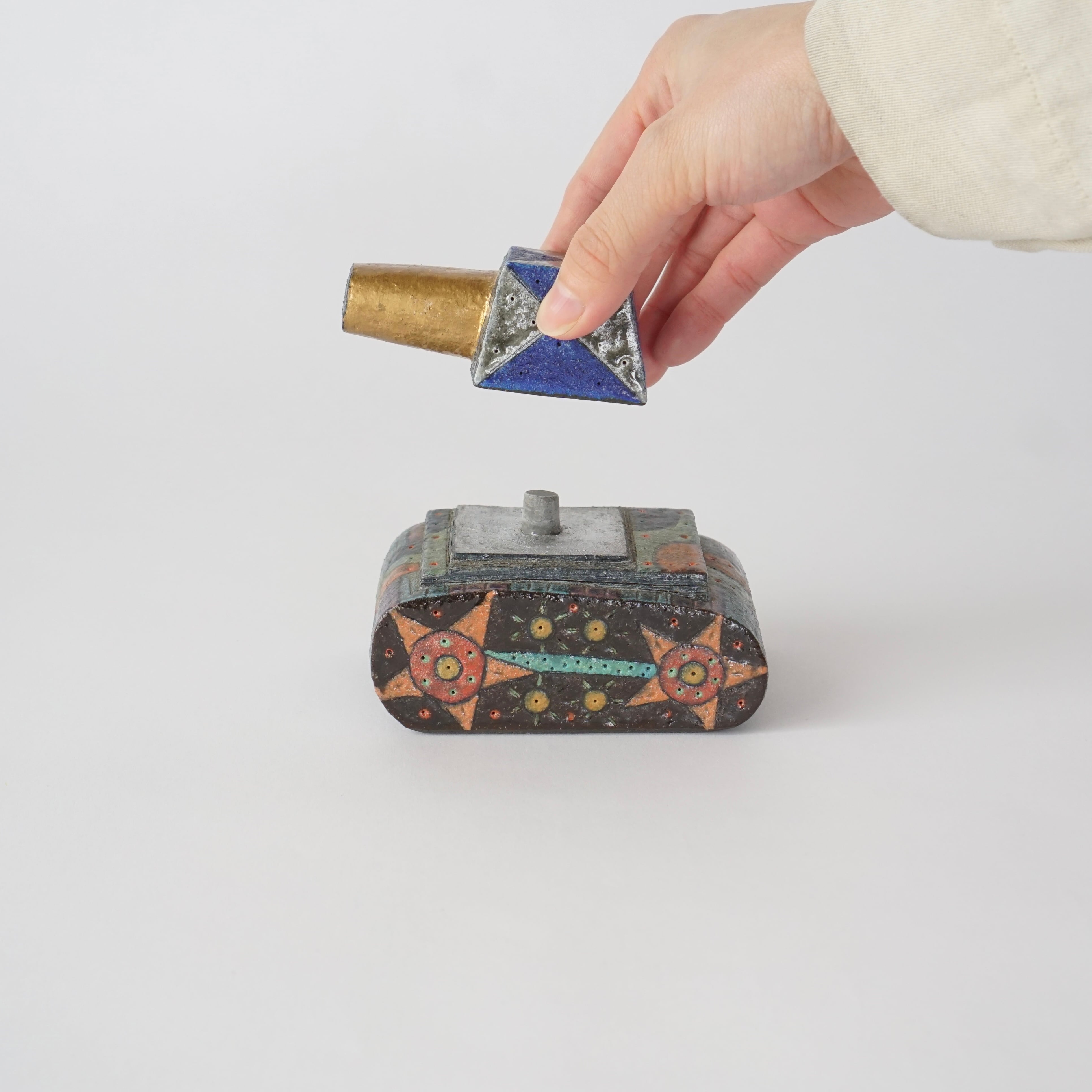 ブリキのオモチャのようなカラフルで少しレトロな雰囲気が漂う戦車の置物。