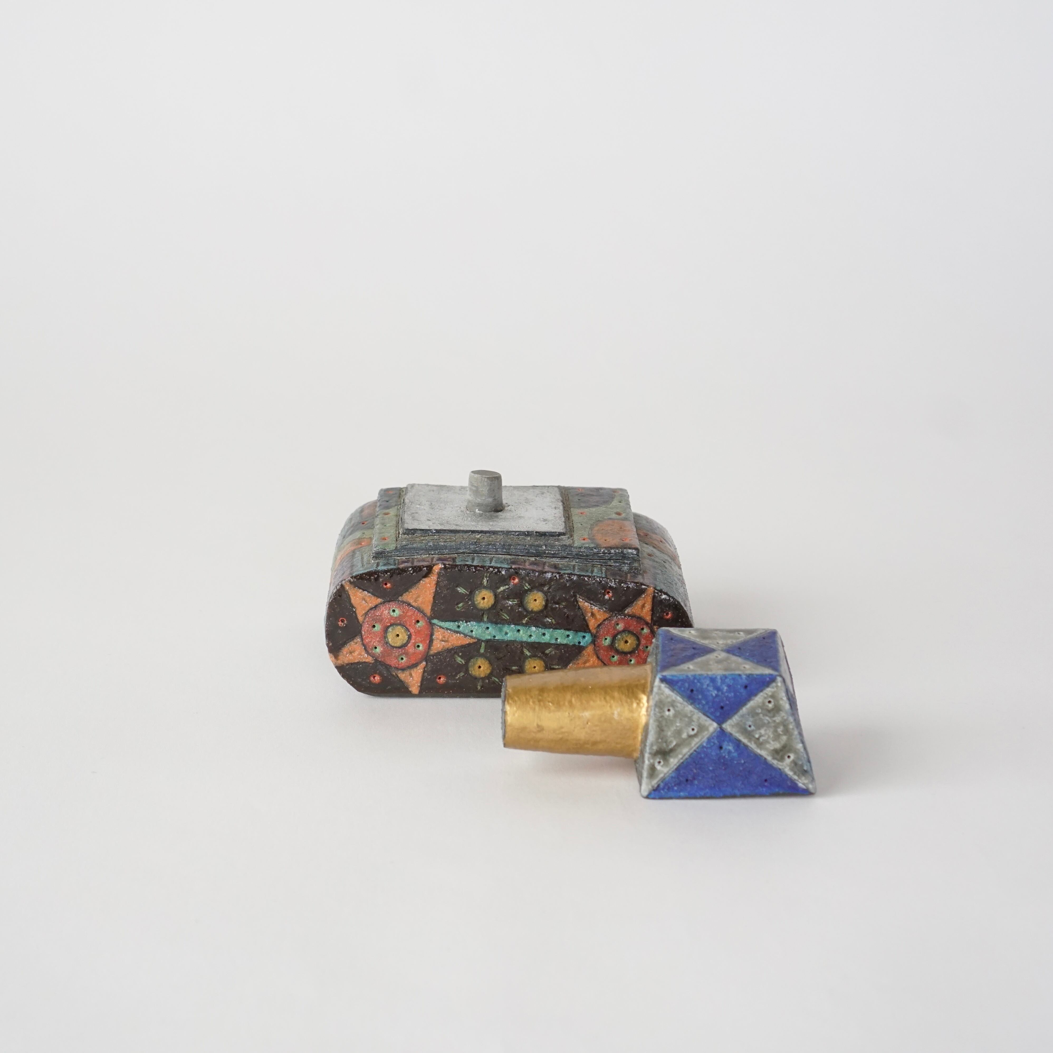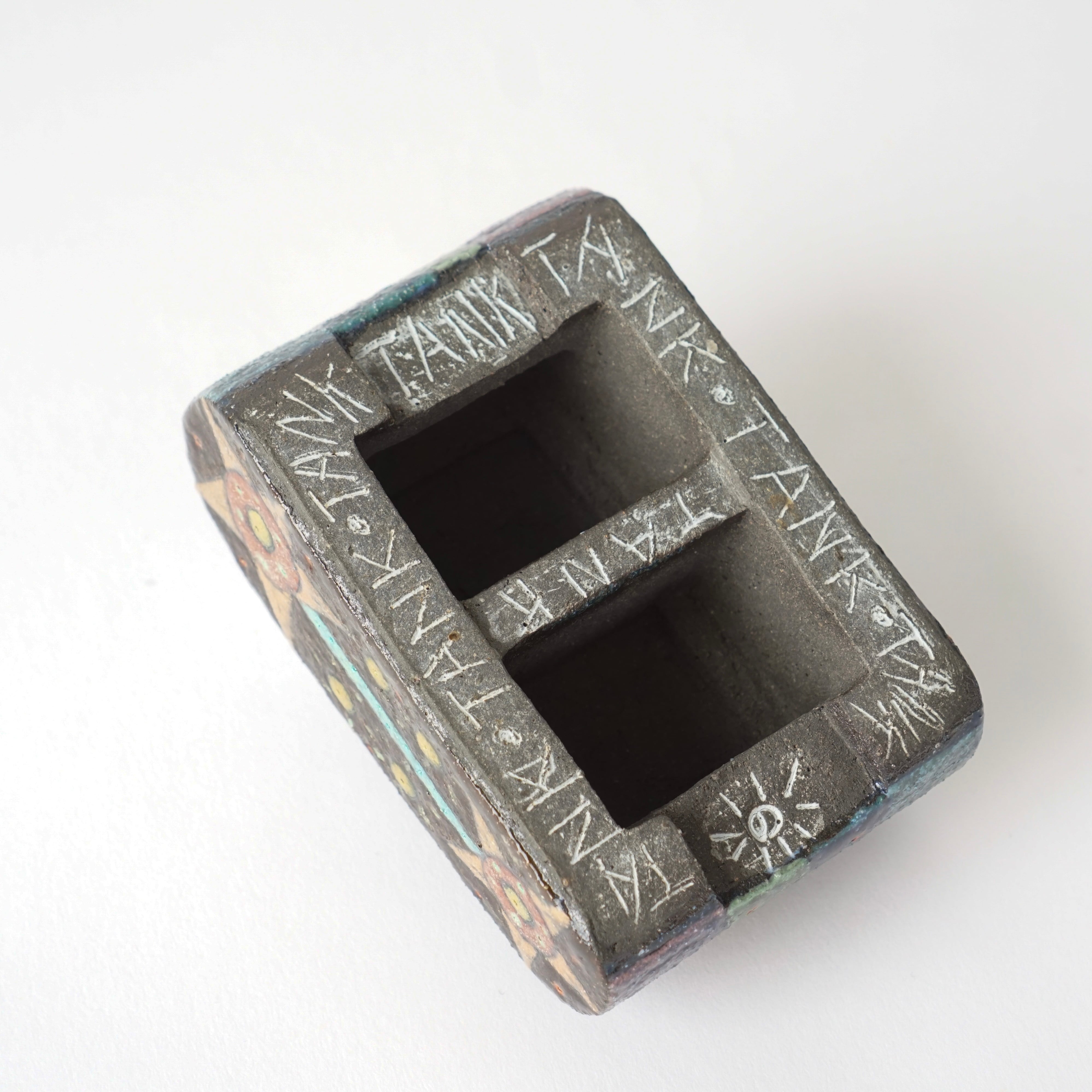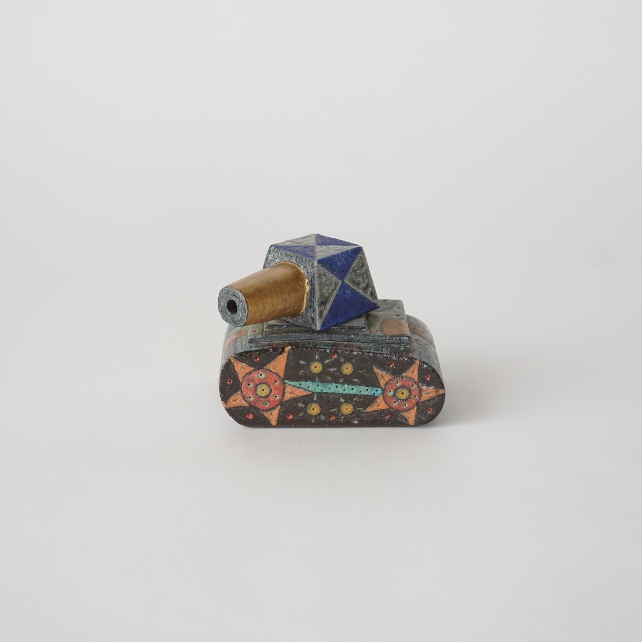 ブリキのオモチャのようなカラフルで少しレトロな雰囲気が漂う戦車の置物。