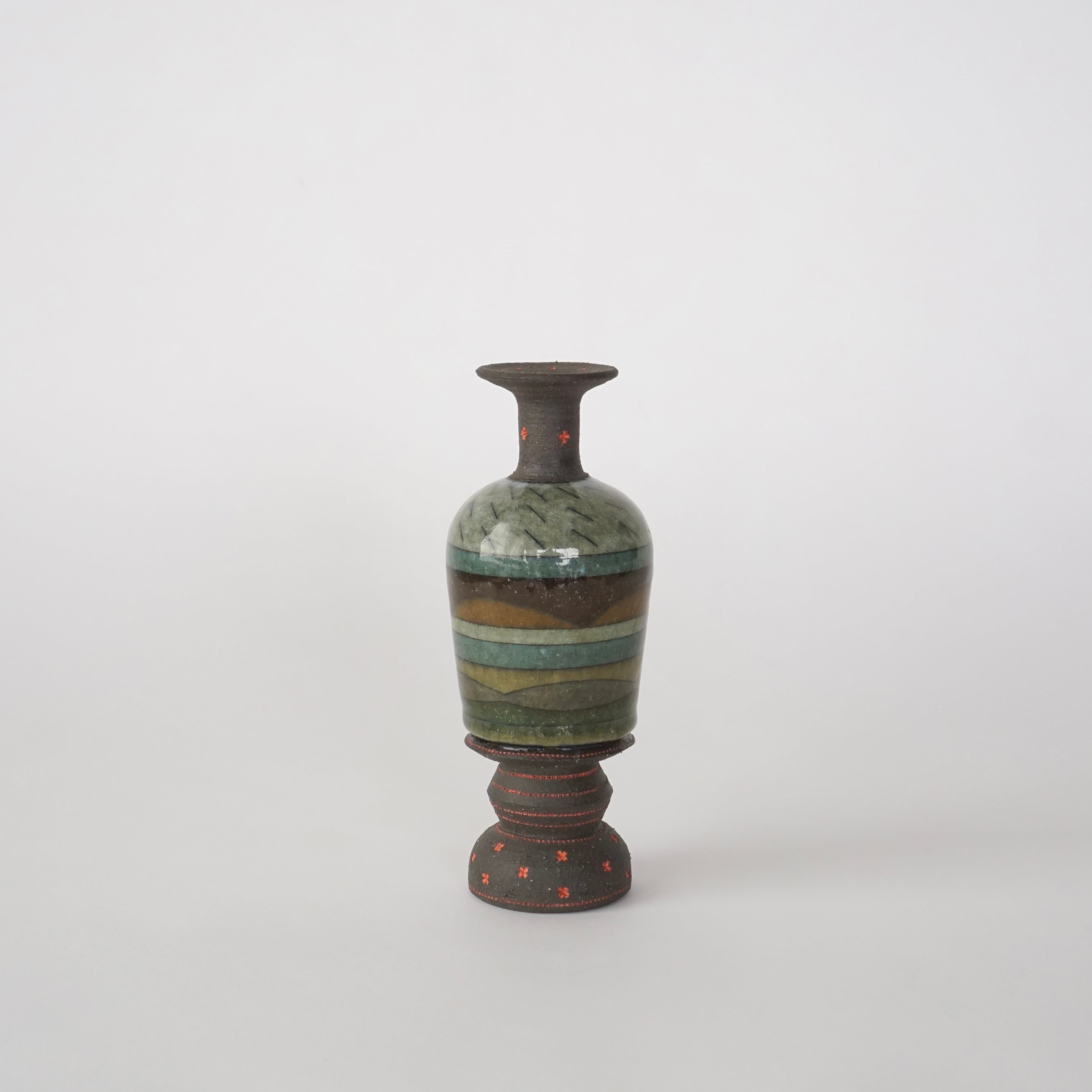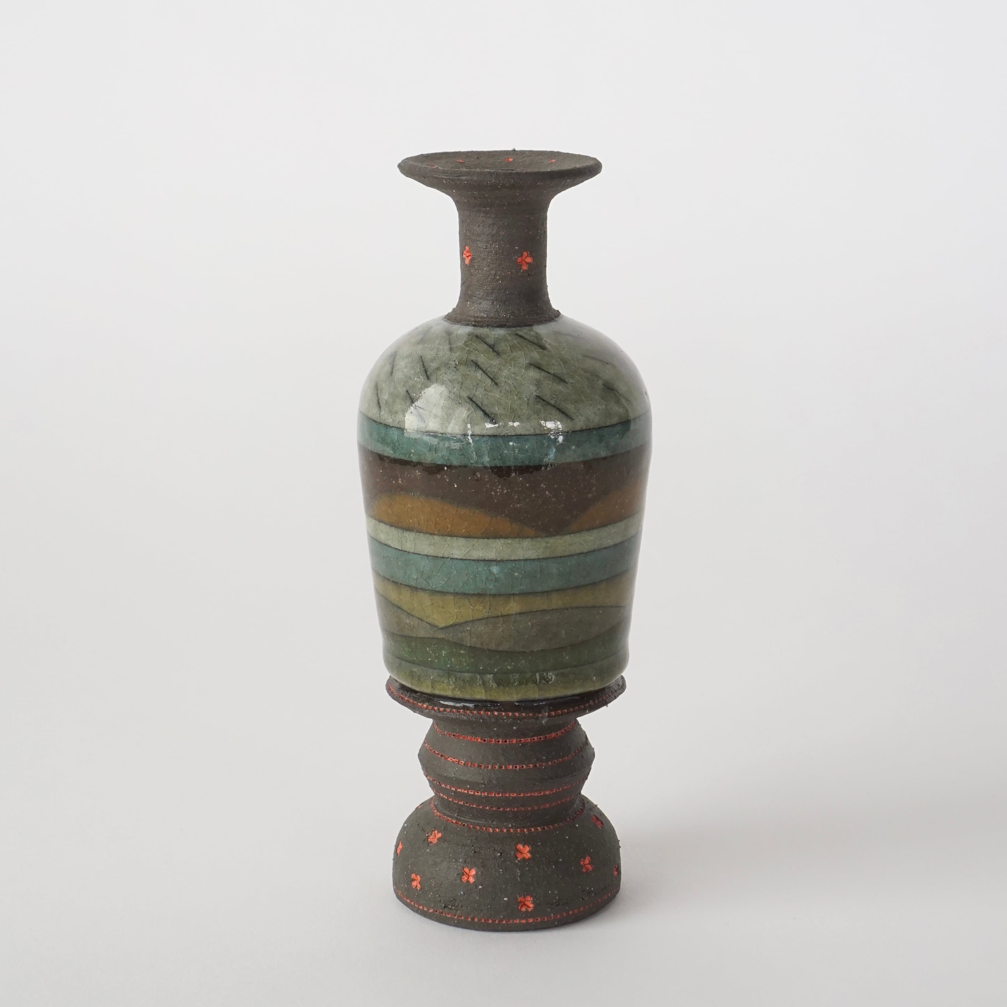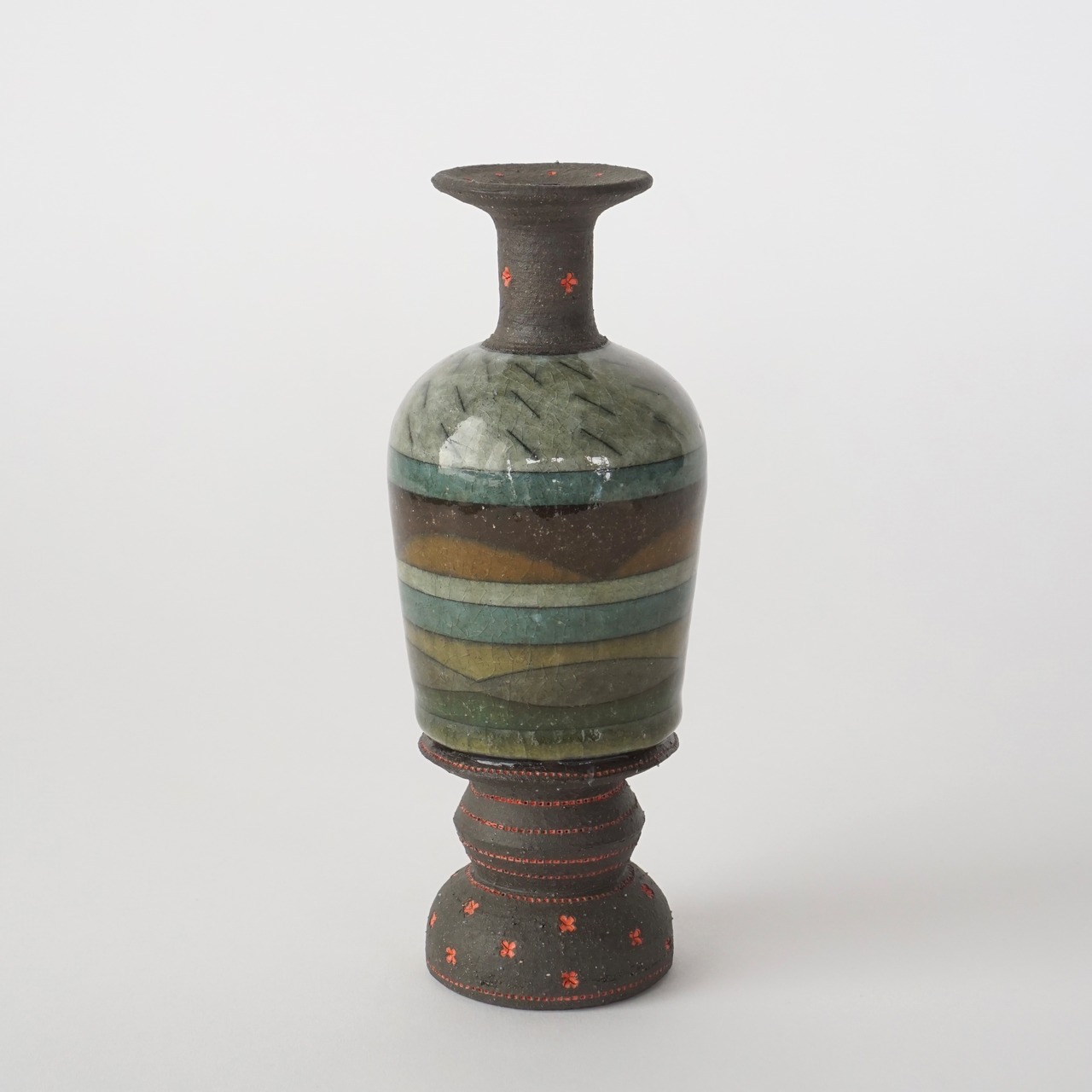 胴は艶のある透明釉仕上げで、首と口、下部は黒土のマットな質感に赤い模様がアクセントになっています。