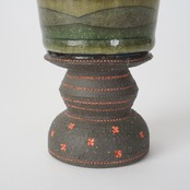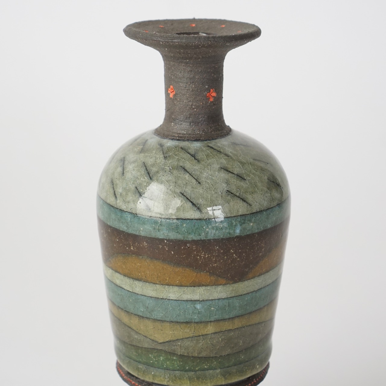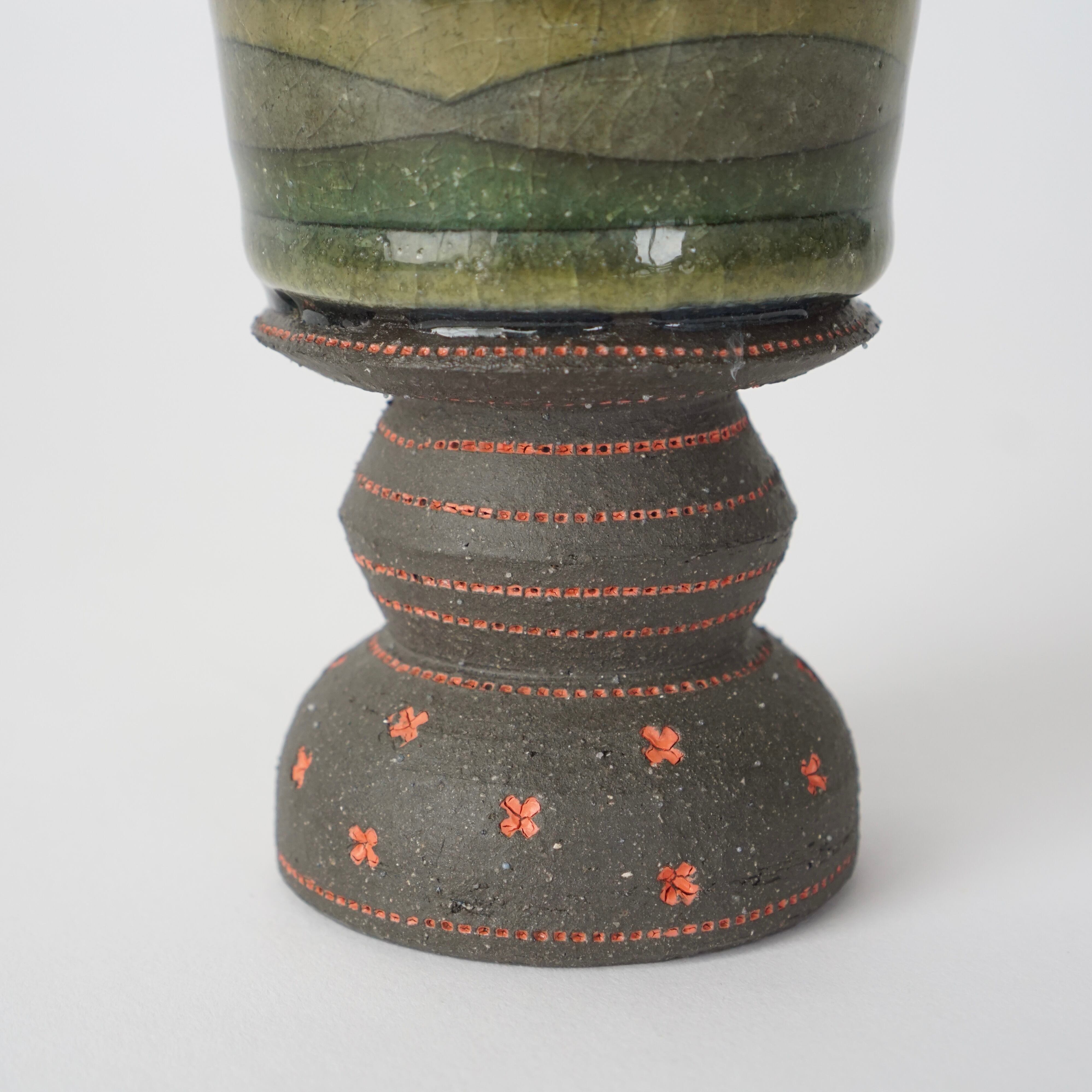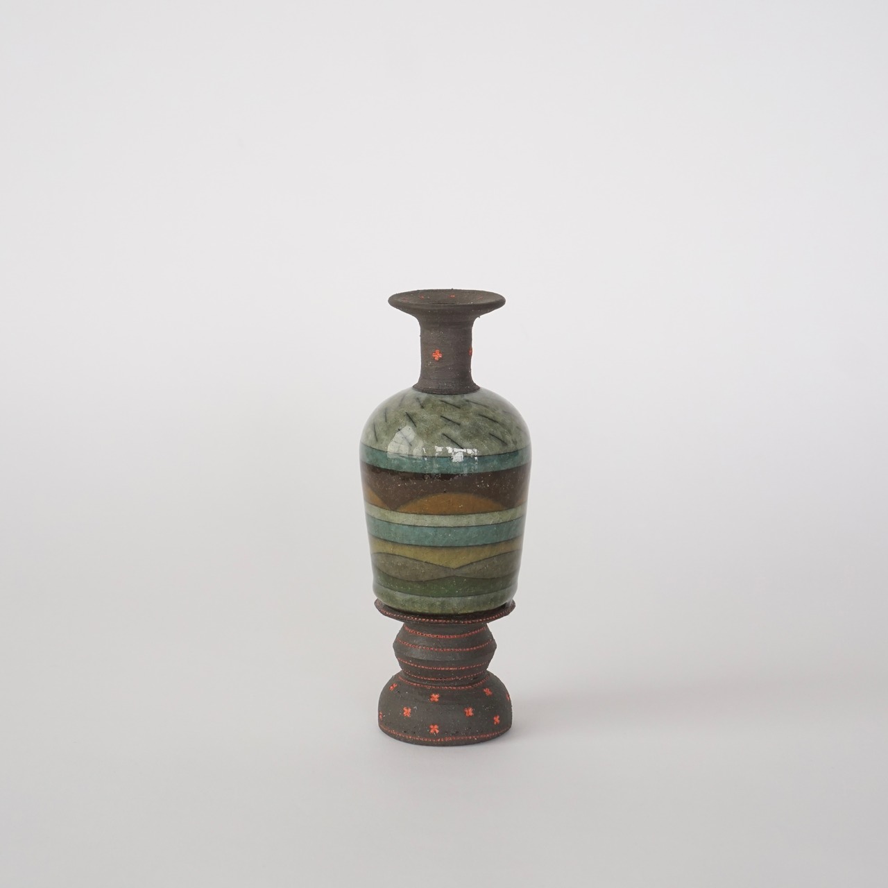 胴は艶のある透明釉仕上げで、首と口、下部は黒土のマットな質感に赤い模様がアクセントになっています。