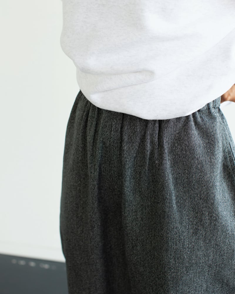 腰はゴム使用になっていて、リラックス感がありながらも張りのある生地で様々なシチュエーションに着用できるデザインです。紐で調節可能。