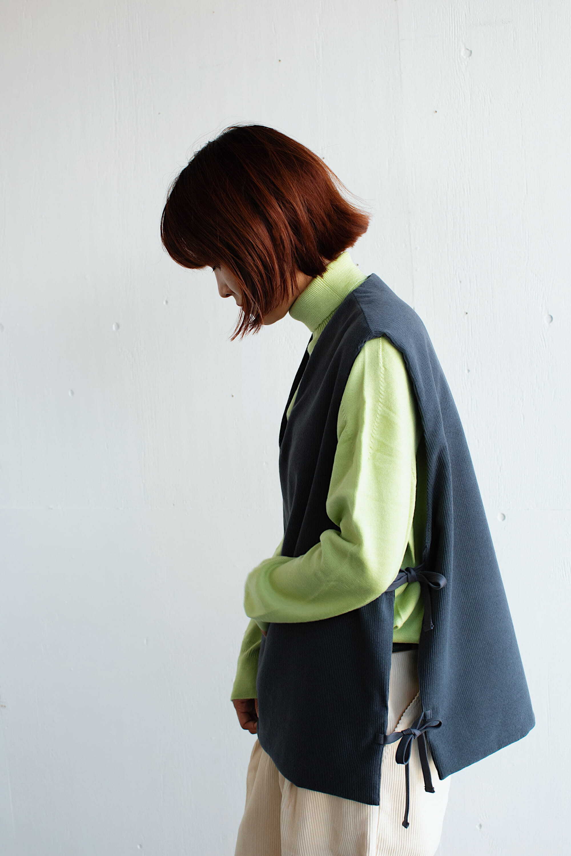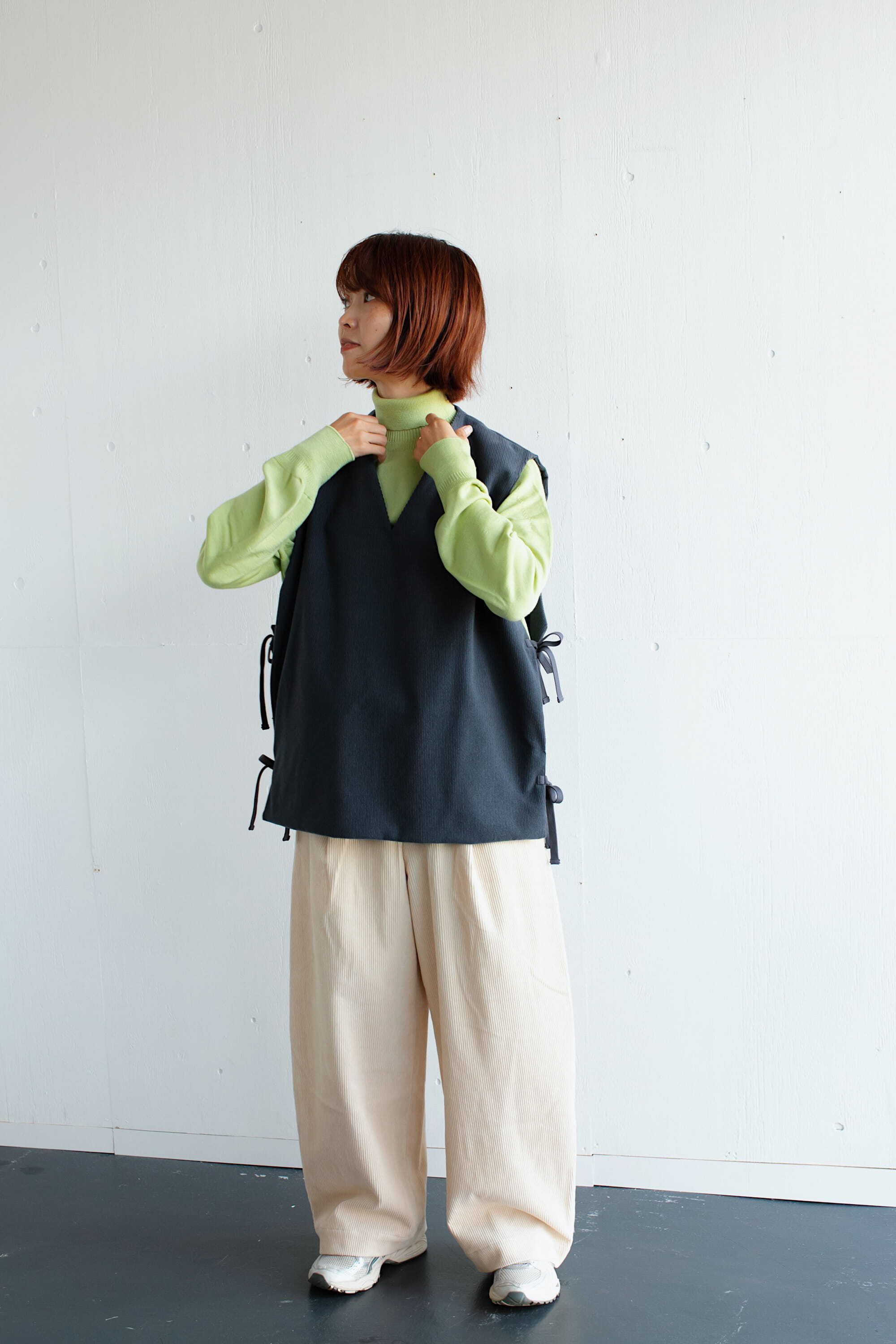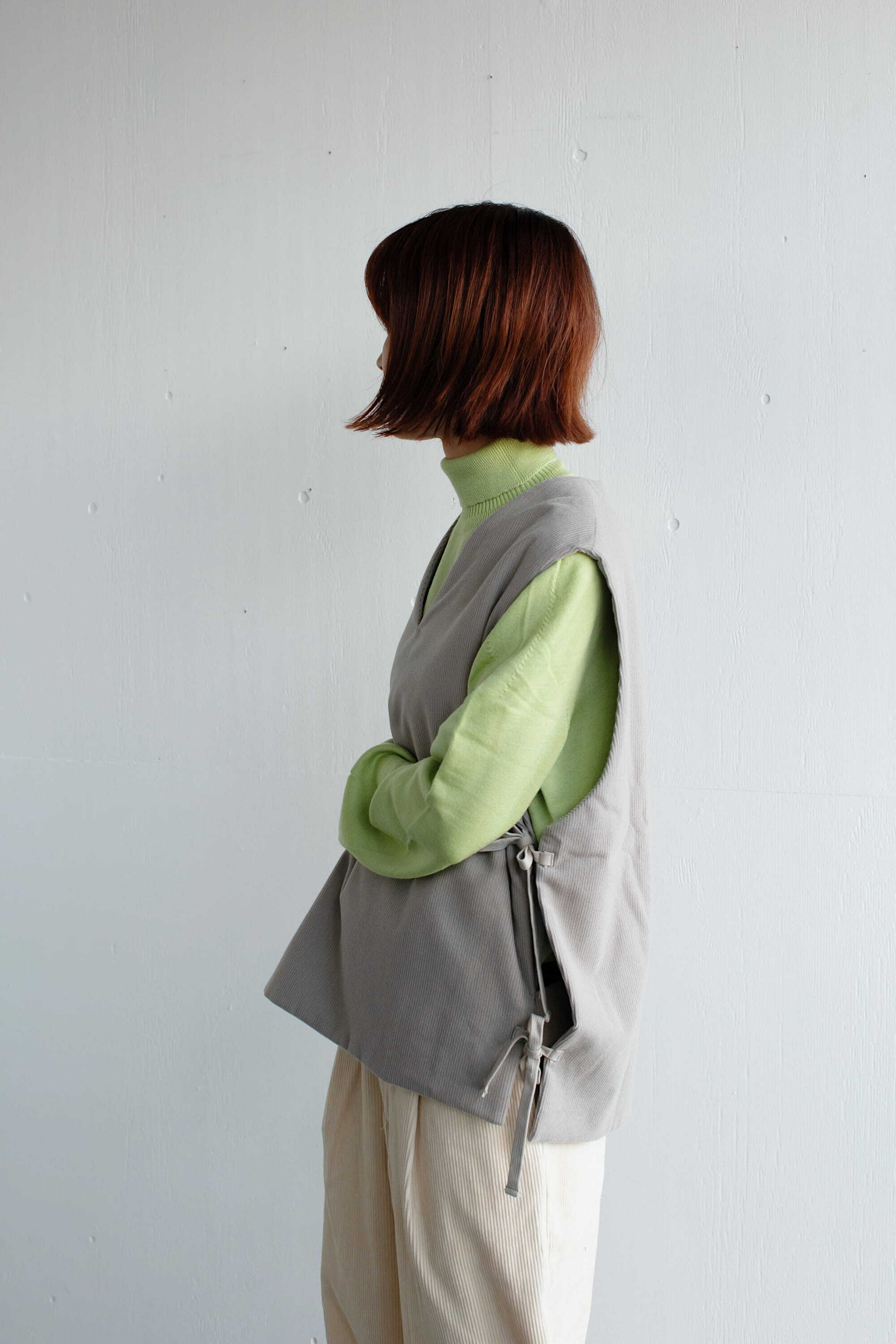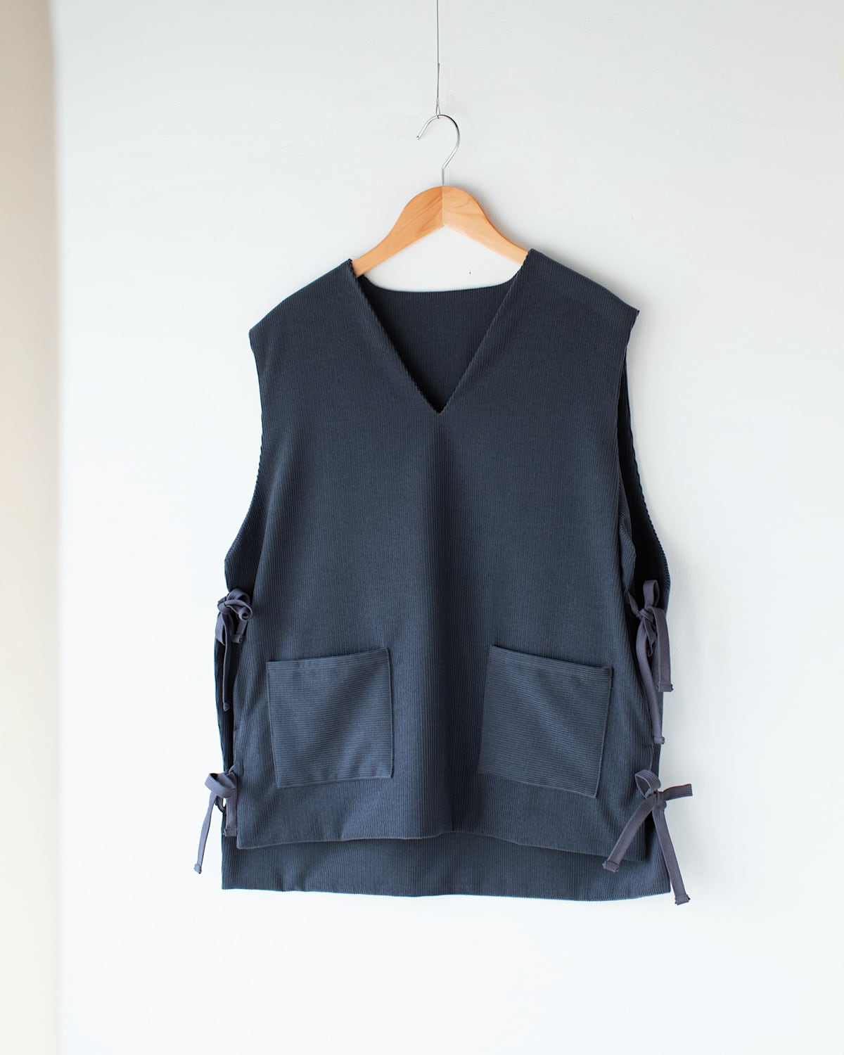 サイドは2箇所ずつリボンで縛るタイプになっており、着るお洋服によって調節していただけます。ゆったりとした身幅で重ね着し易く、シャツやニット、ワンピースなど、様々なアイテムと合わせてお楽しみください。