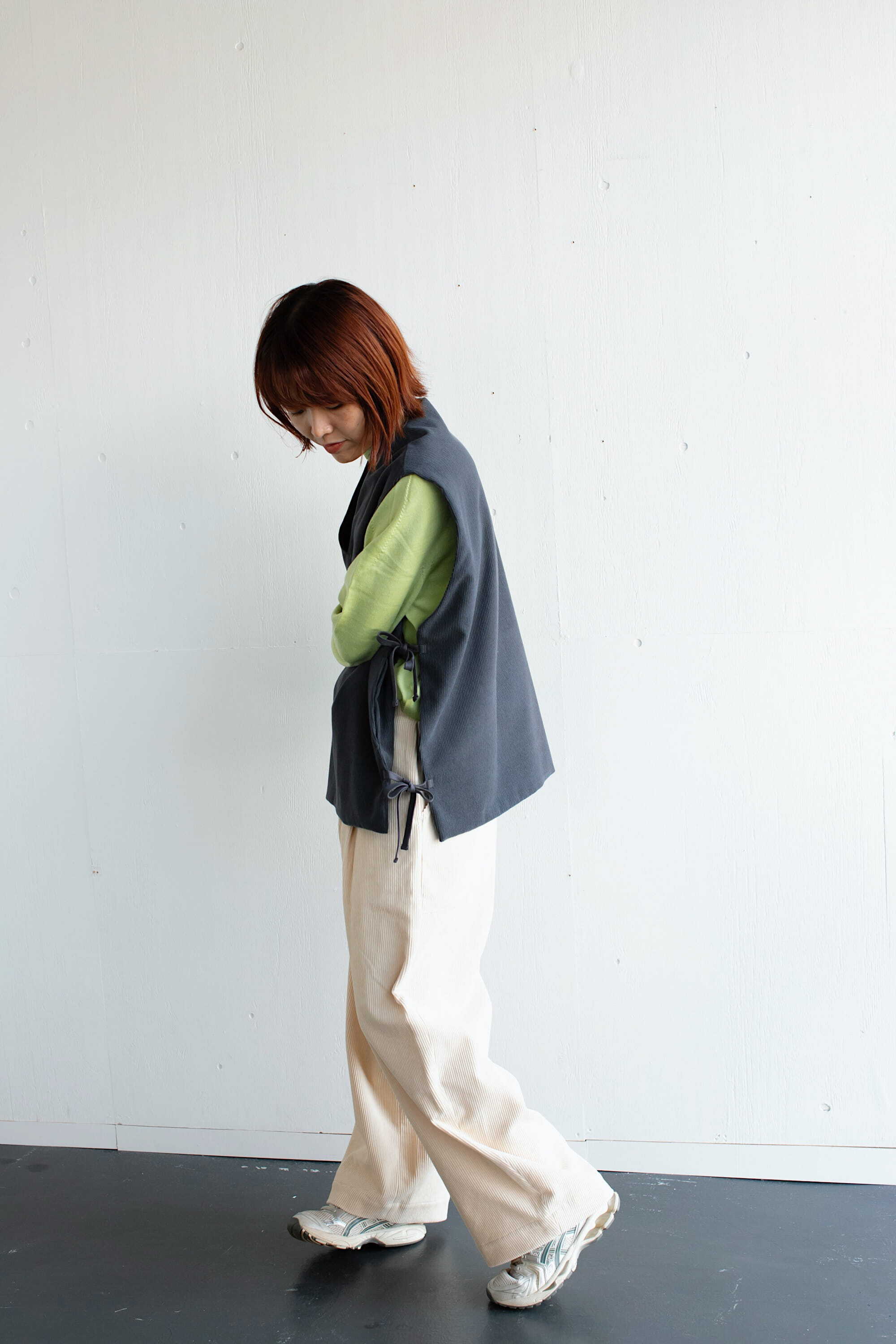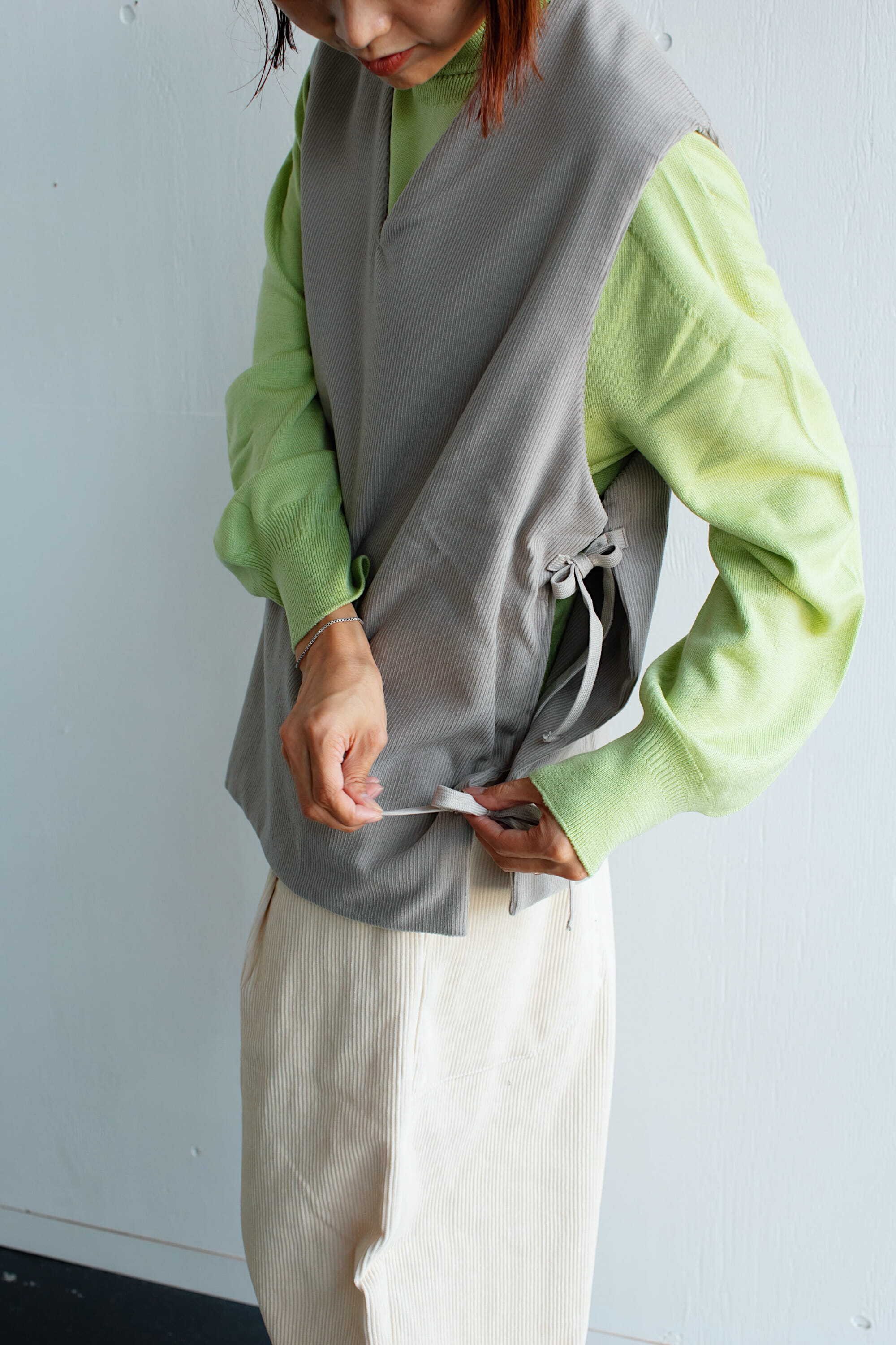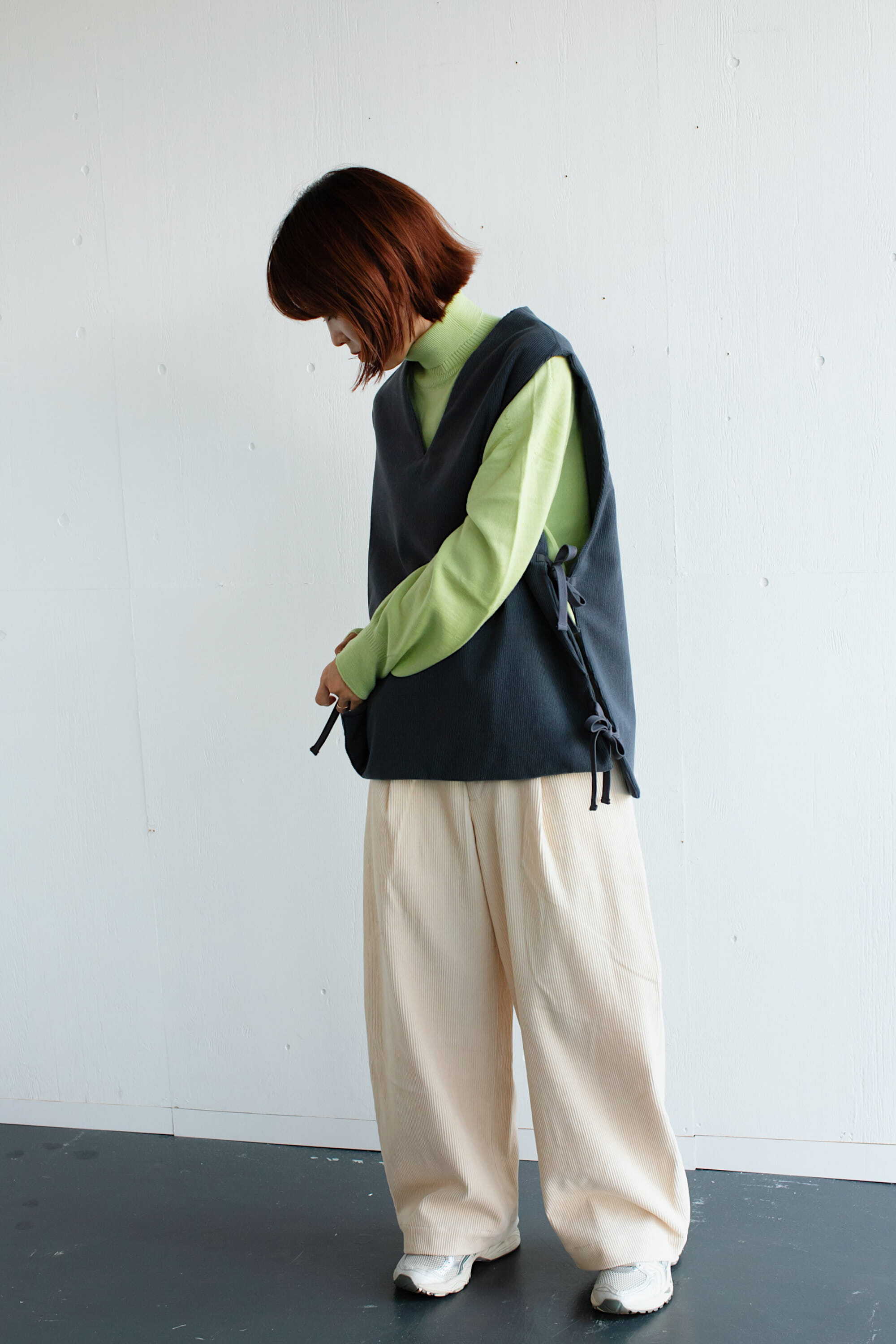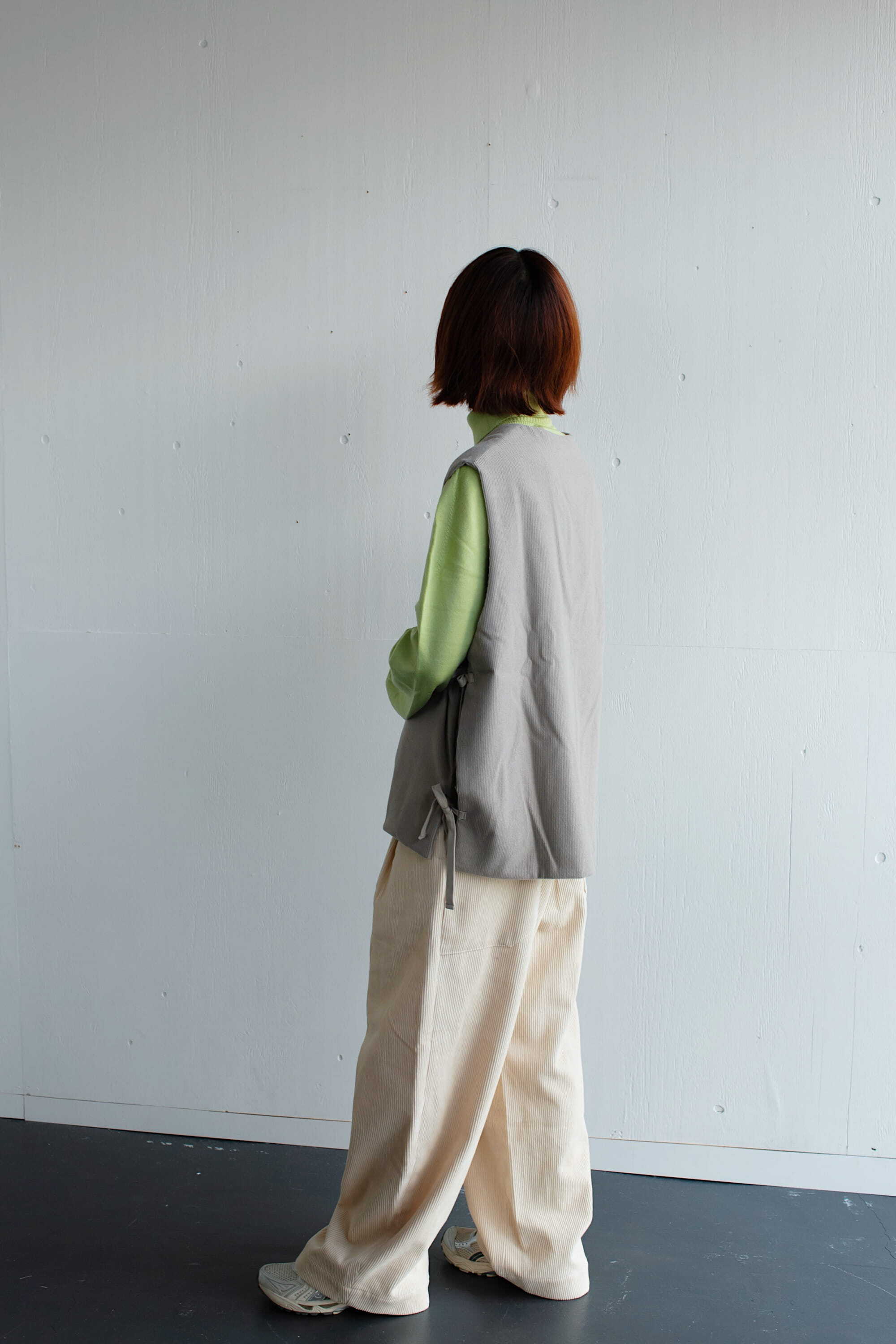 サイドは2箇所ずつリボンで縛るタイプになっており、着るお洋服によって調節していただけます。ゆったりとした身幅で重ね着し易く、シャツやニット、ワンピースなど、様々なアイテムと合わせてお楽しみください。