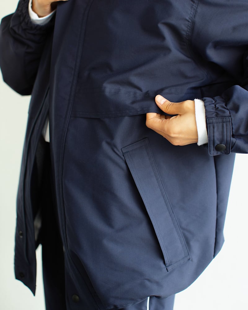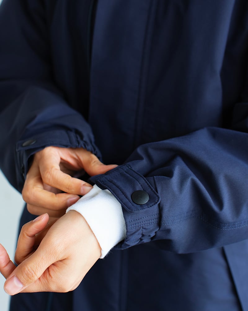前身頃と内側にそれぞれポケットが2箇所あり、襟の部分のマジックテープをあけるとドローコード付きのフードも収納されています。