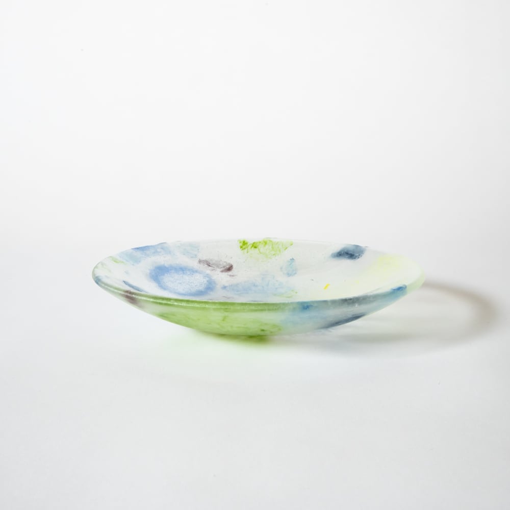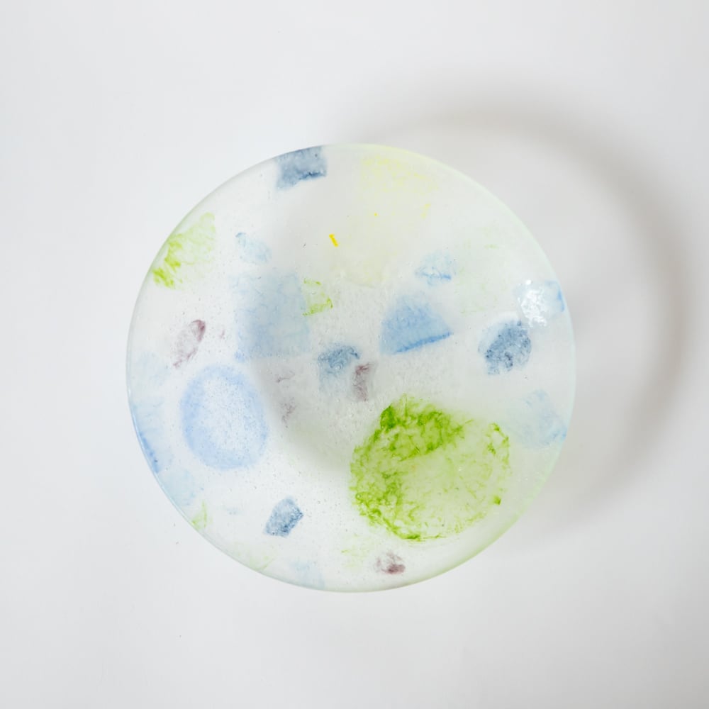 過去の試作に使用したガラスの破片を用いてデザインされたガラスの器です。