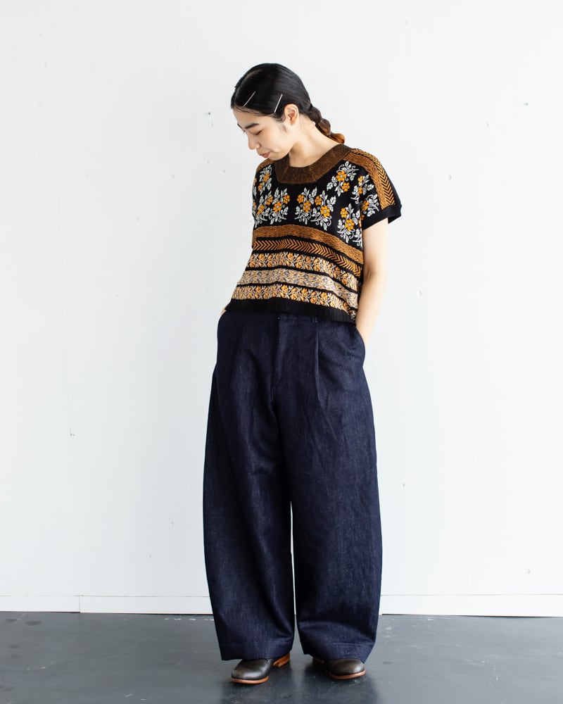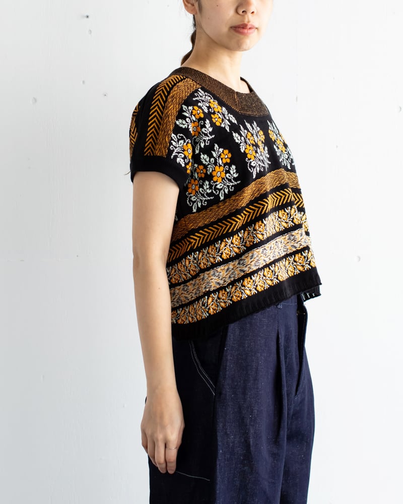 ダブルジャガード、シングルジャガード、レース編みなど様々な編み方が混在されているので、編み地に凹凸があり手刺繍の様な温もりのある雰囲気に仕上がっています。